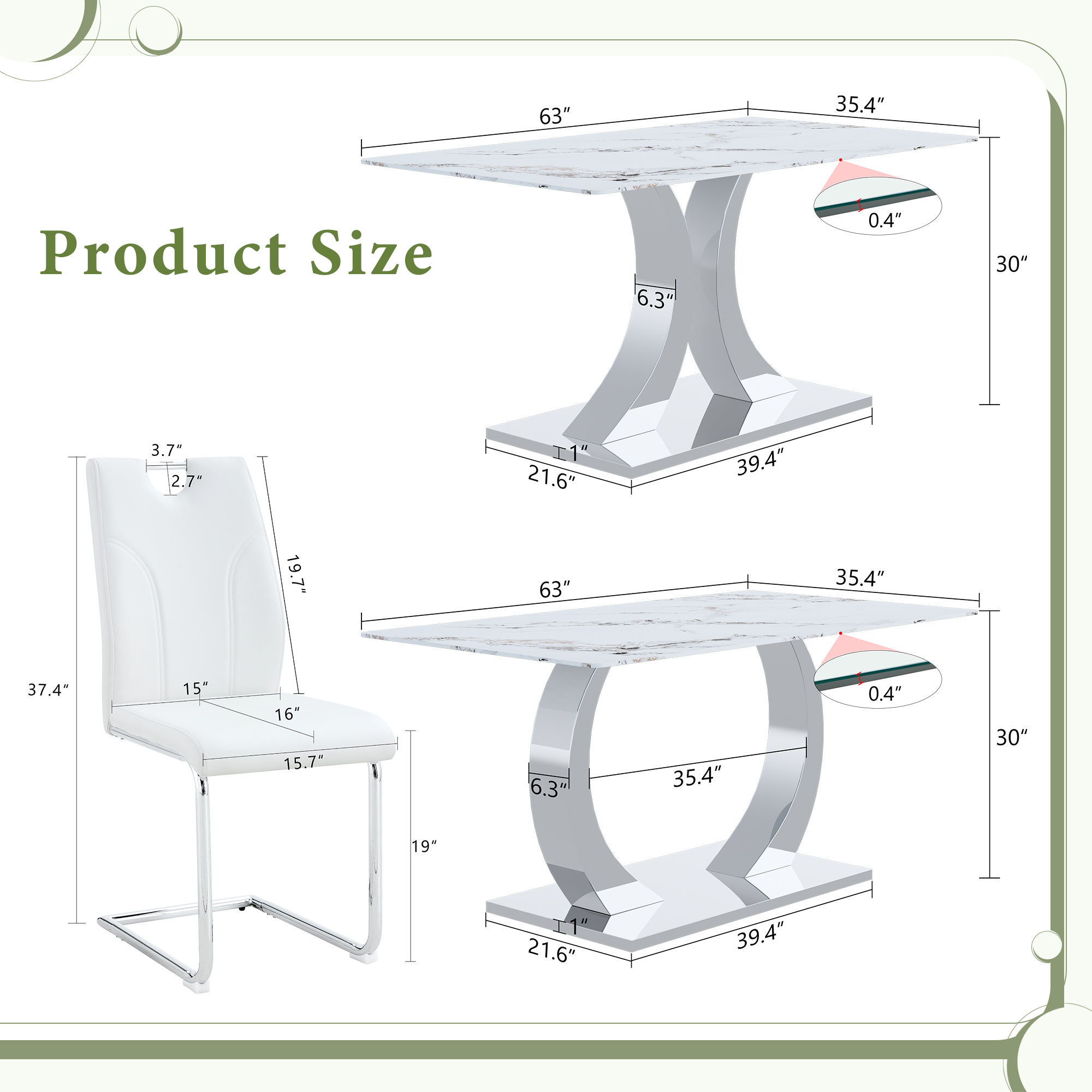 Modern Marble Vein Glass Dining Set - Chrome Base 4-White Chair Contemporary Furniture